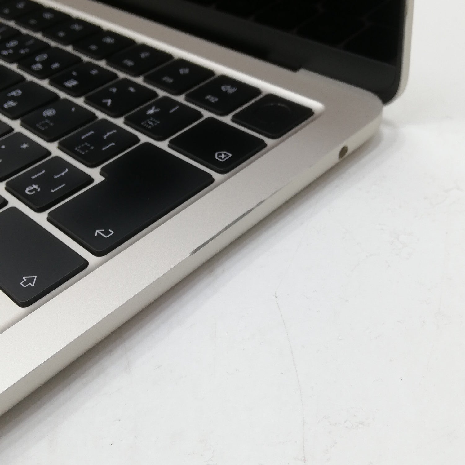 【バッテリー充放電回数多い】 / [液晶] 描画良好。表面中央周囲に注視するとわかる程度の薄いキーボード圧迫痕・まばらに微細コーティング荒れ、液晶パネル下部フチ沿いにごく軽微なコーティング剥離あり。/ [内側] キートップテカリ、右リストテカリ、本体側右エッジ面・液晶側右枠部分にそれぞれ薄い削れ傷あり。 / [外観] ヘッドフォンジャック付近にごく軽微な打痕・小傷、林檎マークに擦れ傷あり。特記以外に大きく目立つ傷はなく、比較的使用感の少ない個体です。/ 箱欠品 /2022年7月発売